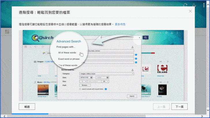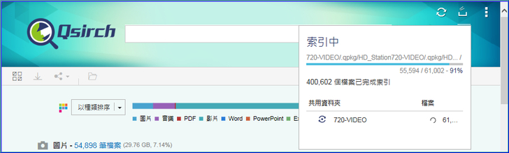 【▼】第一次啟動Qsirch時會針對NAS內的檔案進行索引,這索引時間會依照檔案多寡而有快慢,索引完之後,之後找檔案就超快!