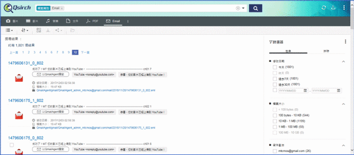 【▼】搜尋郵件與聯絡人資訊Qsirch 可搜尋透過 QmailAgent 集中儲存於 QNAP NAS 的所有 .eml 格式郵件,找到內容符合關鍵字的郵件,同時輕鬆回覆、轉寄,或撰寫新郵件。其中表列顯示可看見信件內容,縮圖預覽就只能看見相關檔名與圖示而已。