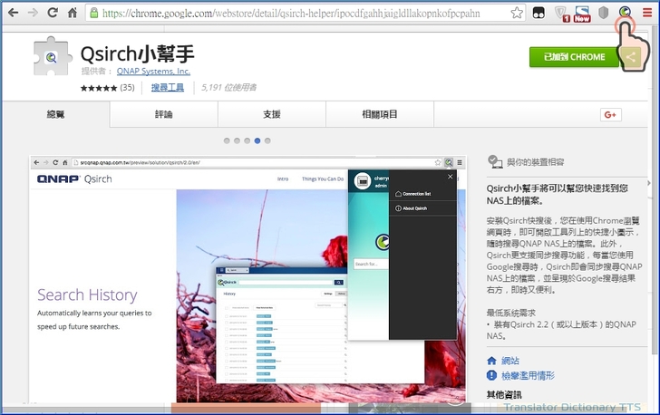 【▼】QNAP專為 Chrome™ 與 Filefox® 瀏覽器開發的外掛程式「Qsirch小幫手」,讓您在瀏覽網頁時,也可隨時搜尋 NAS 上的檔案。