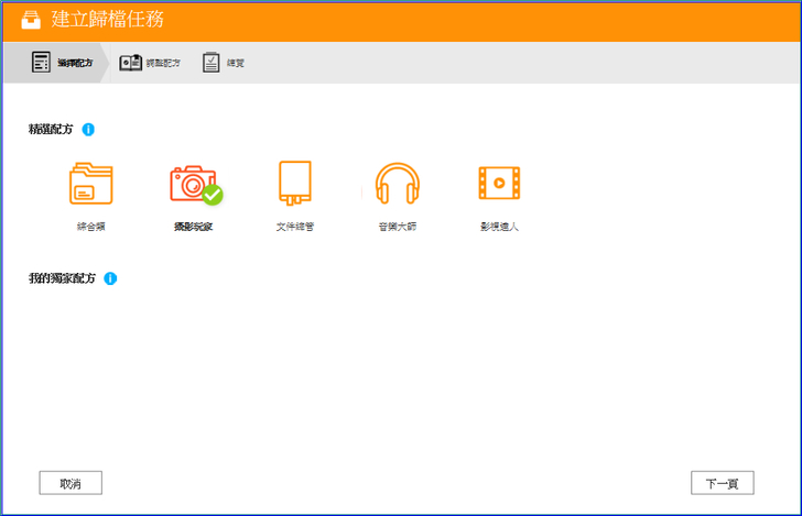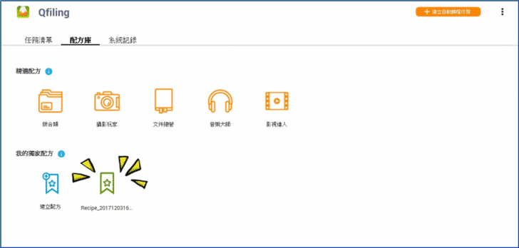 【▼】建立歸檔任務時,您可選擇套用配方庫中的精選配方或是已建立的獨家配方,以便迅速完成歸檔任務設定。QNAP好心提供的配方有綜合類、有針對拍照、錄影的攝影玩家與影視達人,發燒客獨享的音樂大師,若您是可憐的辦公室文書小組,也有提供文件維管,讓您事半功倍!至於獨家配方是自訂任務時可添加的選項。