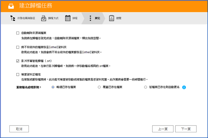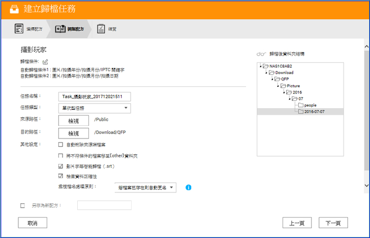 【▼】小編就以攝影玩家作個示範,任務名稱可自訂,任務類型看是單次或是排程型任務,接著就是來源與目的路徑的選擇了,其他設定小編是建議把影片字幕(SRT)智能歸檔與檢查資料正確性打勾即可,重複檔名處理原則選自動更名較為保險些。