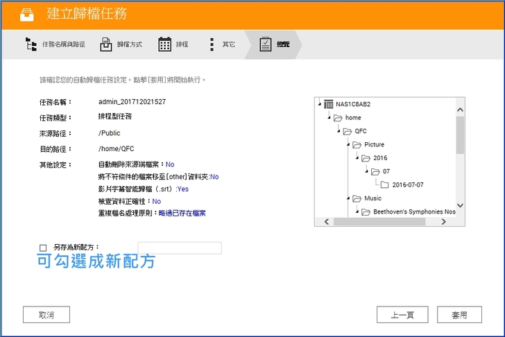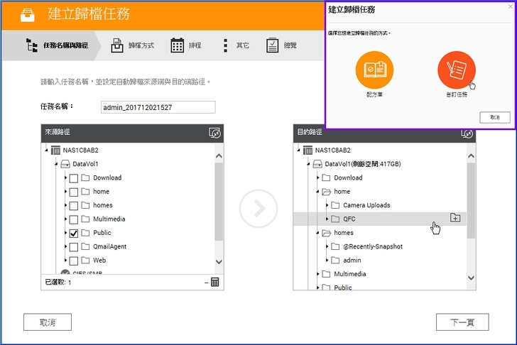 【▼】前面是用QNAP配方庫來歸檔,那自訂任務又是如何呢?直接先選來源與目的路徑,並給個任務名稱。