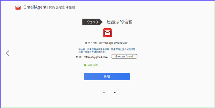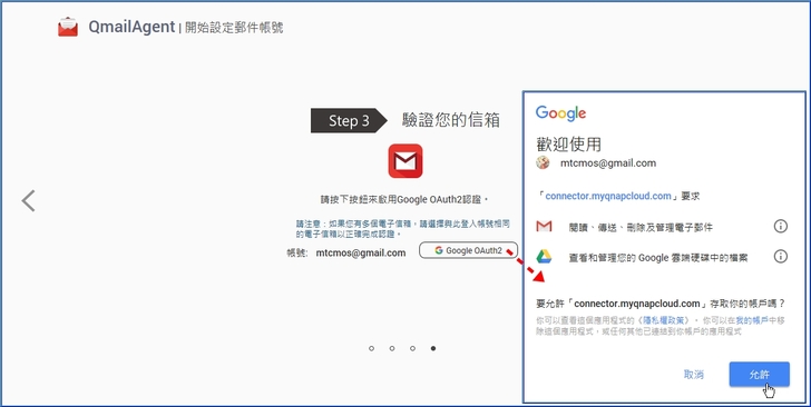 【▼】QmailAgent 必須經過授權才可存取您的 Google 帳號。請點擊[Google OAuth2]以開 Google帳戶登入授權頁面驗證您的信箱,按下允許。