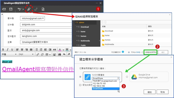 【▼】透過QmailAgent撰寫新郵件時,基本上字型、排版與常用的功能都與Gmail、Outlook一樣,添加附件時也只要點擊迴紋針選取NAS中的檔案即可,若超過10MB會以寄SmartShare等連結,10MB以下才會附在郵件中。