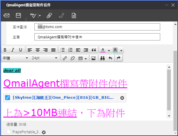 【▼】郵件寫好並帶有附件的情況大致如下,超過10MB以連結表示,小於10MB就會在底下顯示郵件總容量大小(PS:可寄送exe執行檔)