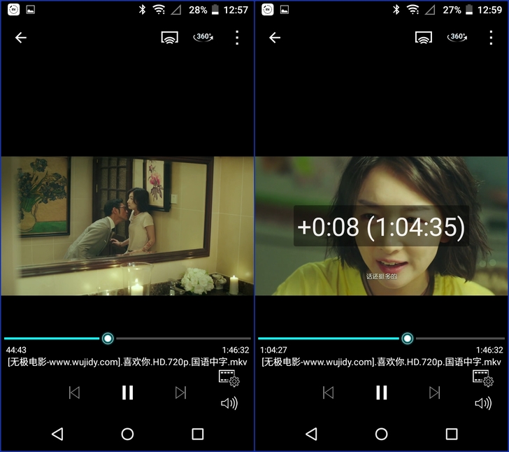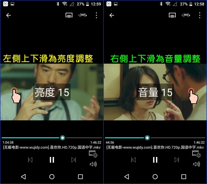 【▼】Qfile播放器在螢幕左側上下滑動為亮度調整,而螢幕右側上下滑動則是音量調整。