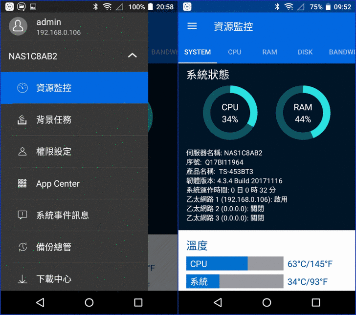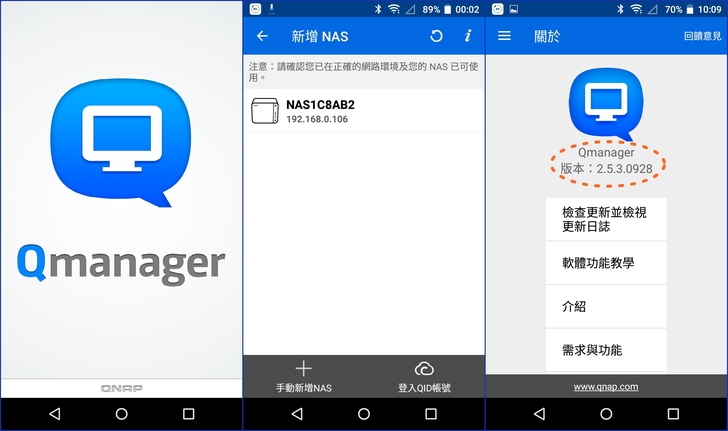 【▼】小編Android手機體驗的Qmanager版本為2.5.3.0928,其必要條件:Android至少要4.0,iOS 8或更新之版本,QNAP NAS 搭配 QTS4.2(或更新之版本)韌體。