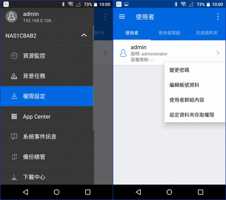 【▼】權限設定中,主要設定使用者帳密資料、使用者群組內容、以及公用資料夾的權限。