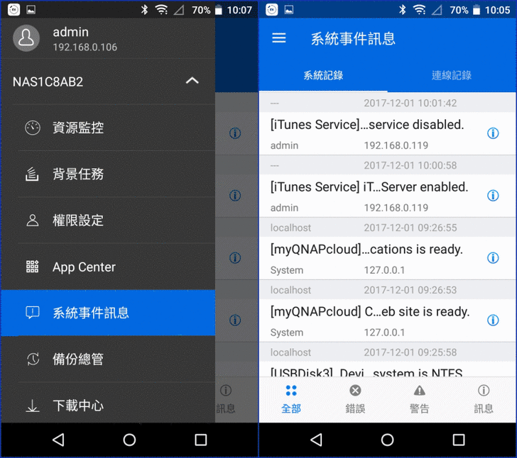 【▼】系統事件訊息中,會顯示系統訊息、警告、錯誤等事件記錄。而連線記錄則會列出所有使用者透過HTTP、FTP、Telnet、SSH、AFP、NFS、SMB、及iSCSI 連線至伺服器的相關資訊。