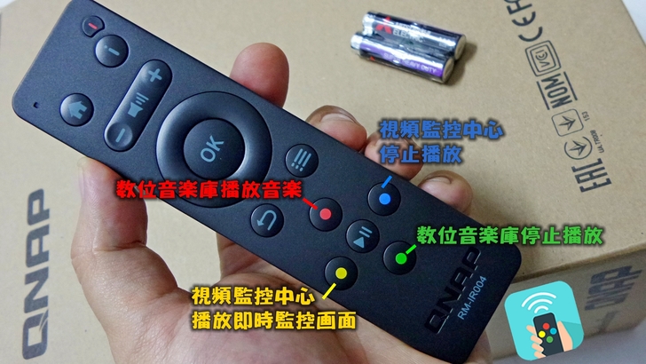 【▼】專屬紅外線遙控器 RM-IR004,使用 2顆 AAA 電池,尺寸 (H x W x L): 146 x 39 x 22.6 mm,與模擬遙控器相比的 Qremote App 來說,實體拿起來特別的順手。輔以 QButton,您可以將喜愛的 NAS 功能設定至遙控器上的彩色按鈕,彈指之間輕鬆切換各種 NAS 功能,例如播放音樂,檢視預設攝影機畫面,重新啟動或關閉 NAS。