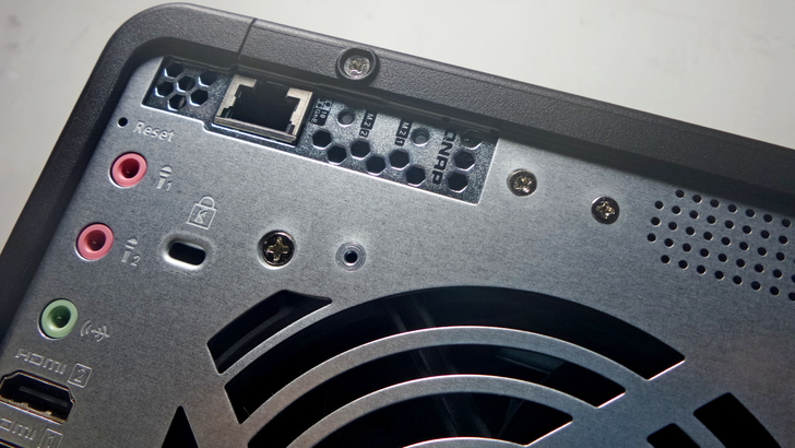 【▼】NAS 有喇叭孔不稀奇,但居然有兩個麥可風輸入,配合 OceanKTV App,簡直就是錢櫃就是你家,而且還內建2瓦揚聲器,能播放音樂與TI語音警示。在PCIe 插槽上,預裝了一張 QM2-2S10G1TB01 擴充卡,提供 2 條 SATA M.2 插槽及一個 10GBASE-T 網絡埠。