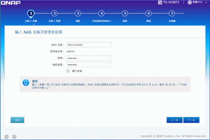 【▼】安裝會有一些基本的設定,包含NAS帳密、日期時間、網路IP、Thunderbolt裝置、跨平台服務、初始化硬碟與是否啟用多媒體等。不用太擔心設錯,因為之後這些設定都還可以作調整。