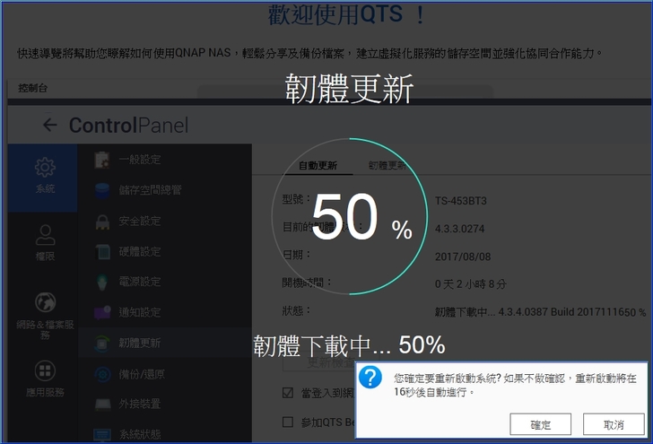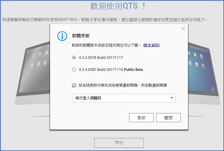 【▼】第一次登入會有韌體更新的訊息,你看看兩個版本僅差一天,這代表什麼?代表QNAP的工程師每天都在為用戶提供更棒的服務。