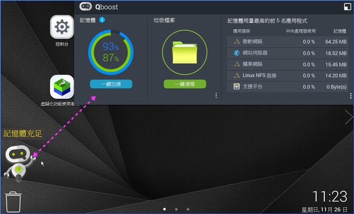 【▼】左下角的小幫手名為Qboost,顧名思義就是幫你一鍵加速釋放記憶體以及一鍵讓系統運行更順暢!