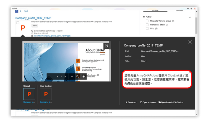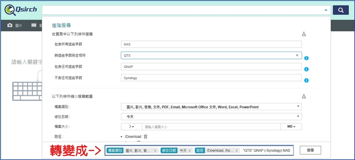 【▼】Qsirch是 QNAP 獨家推出的 NAS 全文檢索搜尋工具,操作上宛如 Google 搜尋引擎一樣簡單直覺,幫助您迅速找到正確的資料或檔案。