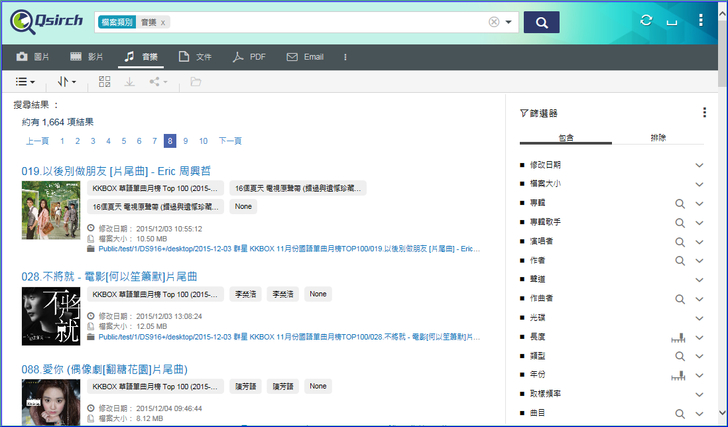 【▼】以音樂檔案作搜尋篩選的選項就高達14種,除了音樂檔案本身名稱與副檔名之外,內嵌的Tag資訊也能一起找到唷~