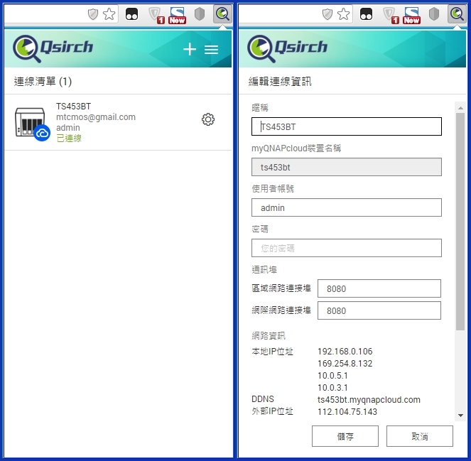 【▼】將套件安裝好之後,可先到編輯設定中check是否與NAS作連接。
