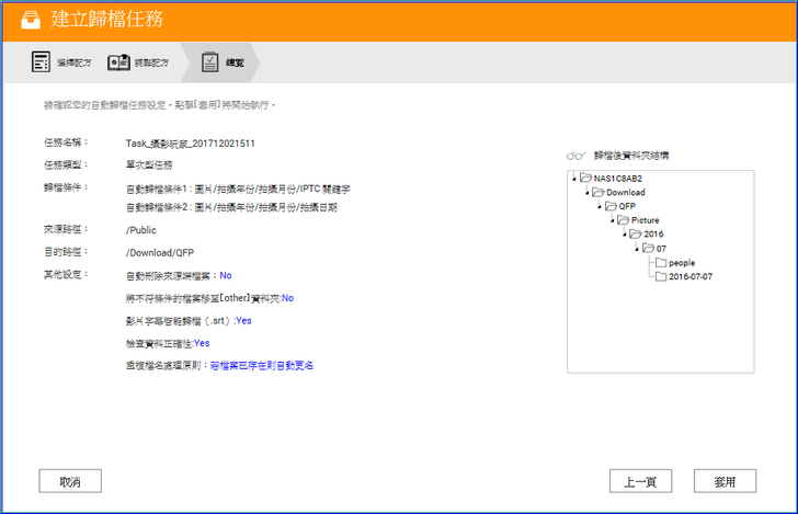 【▼】最後會有個總攬,右邊並顯示路徑的結構圖,單次任務的話,套用即開始執行歸檔動作,排程型任務則是到達時間才動作。