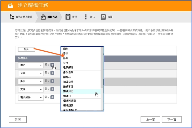 【▼】下一步來到重點的歸檔方式,可在[歸檔條件]中加入檔案類型,類型將近二十多種,讓散佈在各個資料夾的眾多檔案妥善分類、條理歸檔。