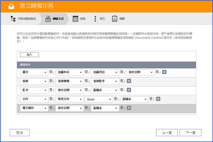 【▼】為每種檔案類型設定歸檔的專屬條件,條件可不只一個,最多就是依檔案類型的篩選數目來分類。