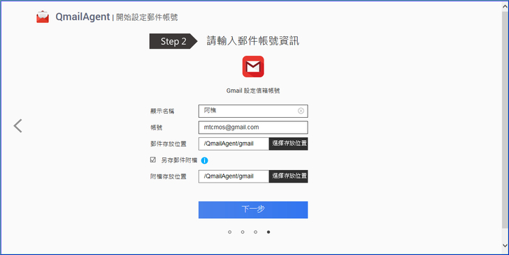 【▼】以Gmail為例,輸入顯示名稱,這邊的顯示名稱僅供QmailAgent內部識別,並非寄信出去的名稱,接著再填入email完整信箱,最後是郵件及其附件儲存於NAS中的哪個位置。