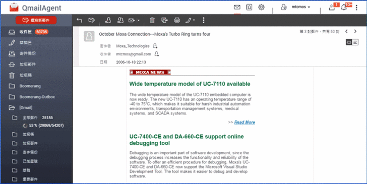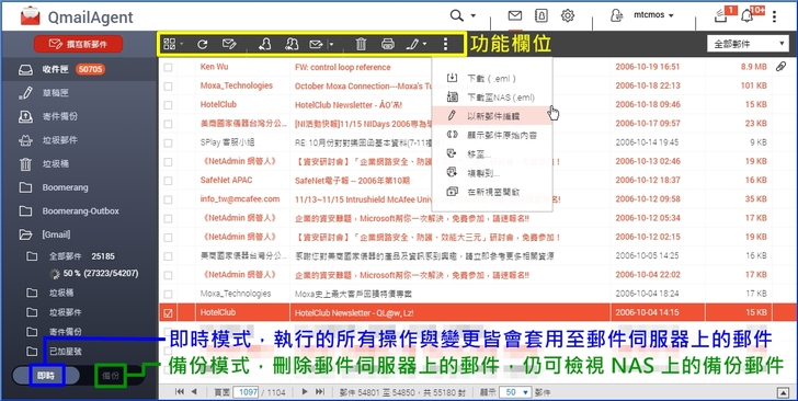 【▼】進入信箱後,可以發現QmailAgent介面很像Gmail,左側有收件匣、草稿匣、寄件備份等內容。使用者可在此點擊上欄功能鍵來選取郵件、重新整理、撰寫新郵件、回覆、全部回覆、轉寄、移至垃圾桶、列印及標記選取的郵件。左下角可切換即時模式或備份模式,在[即時]模式,您進行的所有操作與變更皆會套用至郵件伺服器上的郵件;在[備份]模式,即使您刪除郵件伺服器上的郵件,您仍可檢視 NAS 上的備份郵件。