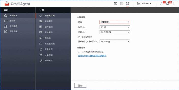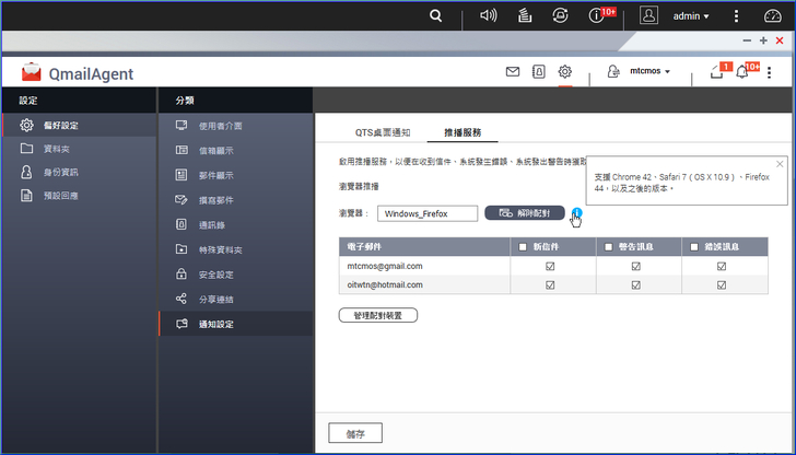 【▼】而在QmailAgent通知設定中的推播服務,無須開啟程式即可在 QTS 系統桌面與 Chrome™、Safari®、及 Firefox® 等瀏覽器上接收推播通知,讓您在第一時間掌握即時訊息。