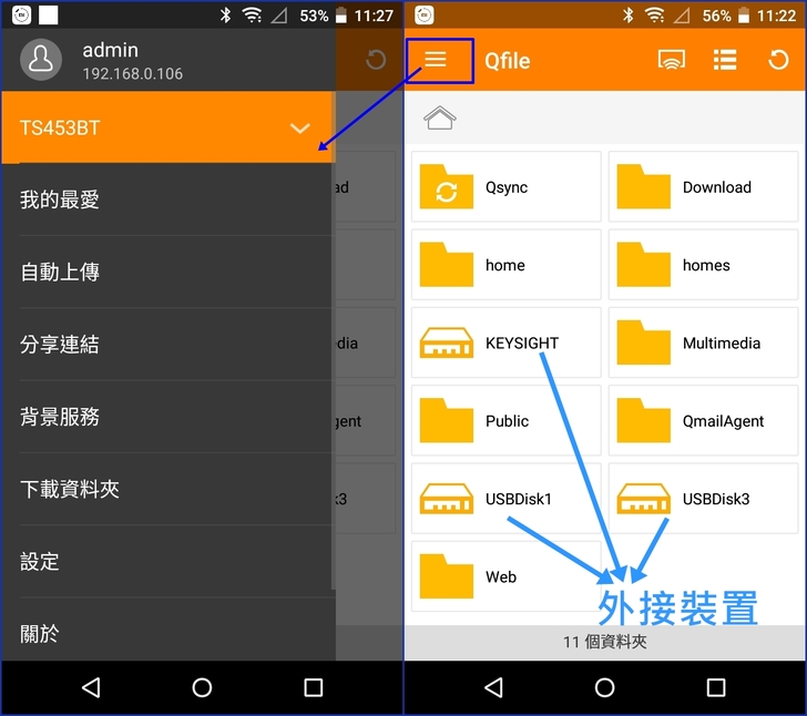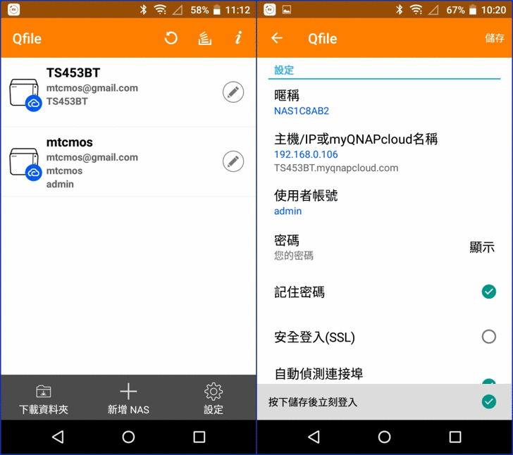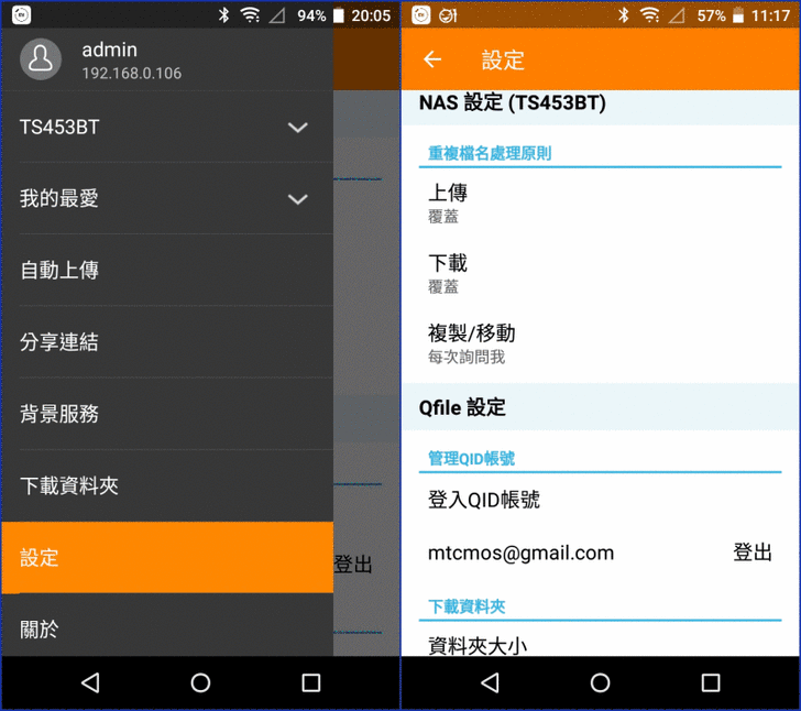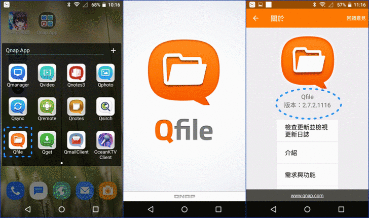 【▼】小編是Android手機體驗的Qfile版本是2.7.2.1116,在外登入NAS的方式有myQNAPcloud、CloudLink、WAN IP、QID等,若只是下上樓層的話,就直接用LAN IP即可。