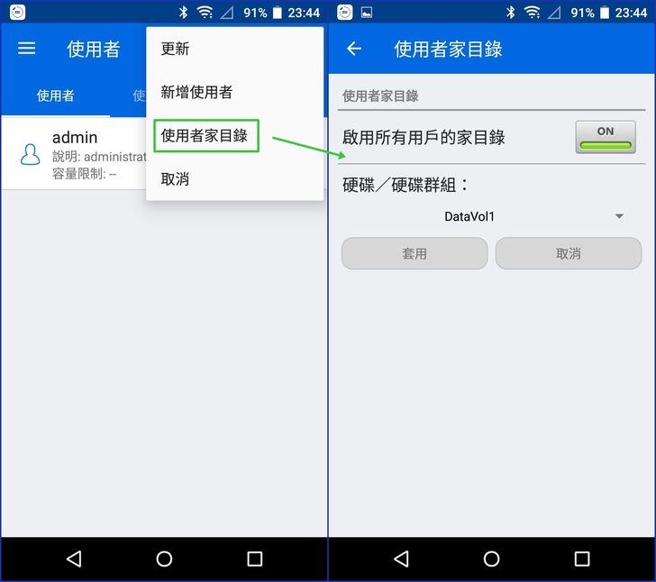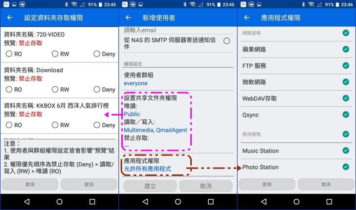 【▼】在新增使用者時,除了基本的帳密要輸入之外,共享文件夾以及應用程式的權限也可在此略作調整,讓系統管理更容易。