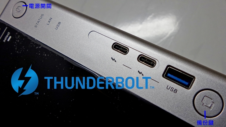 【▼】TS-453BT3將 Thunderbolt 3 的連接端配置於NAS的正面,上下分別有電源鍵以及備份鍵,並移除了 TS-453B有的 SD Card 插槽與USB QuickAccess快速存取埠,無方向性的特性相容於 USB Type-C 裝置,可供 USB 3.1 Gen2 (Type-C) 高速裝置使用。