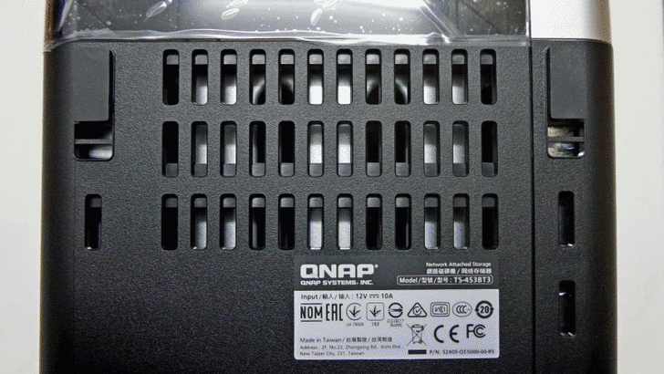 【▼】在TS-453BT3機身底部也有部分挖空作散熱處理,四個角落的防滑膠墊讓NAS更穩固,機身的身分證明也可在此查到。