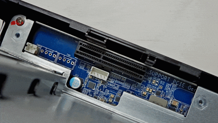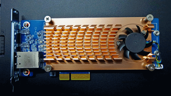 【▼】擴充卡上面有加裝散熱風扇與鋁合金散熱鰭片,一組 PCI-E 擴充插槽,就能同時擁有 SSD 快取與 10GbE 網路升級功能,未來QNAP有機會加入顯示卡的話,我想也不意外吧!