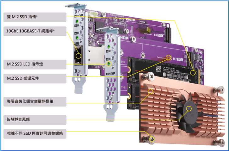 【▼】PCIe介面的雙埠 M.2 SATA SSD/10 GbE 擴充卡,不佔用 NAS 的硬碟插槽,即可輕鬆配置讀寫快取或是啟用 Qtier 自動分層儲存迅速,優化 NAS 效能。