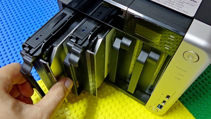 【▼】TS-453BT3是4Bay機種,但由於HGST 10TB硬碟要價不斐,所以在此就先裝兩顆可以組成 Raid1再說,首先將NAS中的硬碟盤給押下抽取出,第二步是將左右兩旁的固定裝置給扳起,第三步將固定裝置對準硬碟螺絲孔位,最後押平即大功告成。過程中沒有用到任何工具,免工具就是讚!