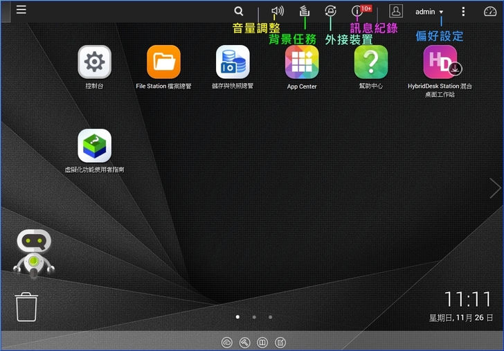 【▼】QTS桌面區分成上排訊息欄位與中間功能圖示,其中訊息欄有搜尋、音量調整、背景任務、外接裝置、訊息紀錄與NAS動作等,而功能圖示以 6列 X 3行的方式排列,顯得寬大好辨識,左邊有類似機器人的小幫手提示與垃圾桶,右邊則是中原標準時間,介面親切好上手讓人感覺相當舒適。