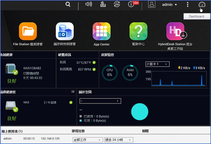 【▼】在主畫面的系統頁面中,可以查看QNAP NAS上的各項資源的使用狀況(CPU使用率、記憶體使用率、硬碟使用率、網路流量狀態、執行程序、以及監控線上使用者),甚至連系統溫度與風扇轉速都能知道。