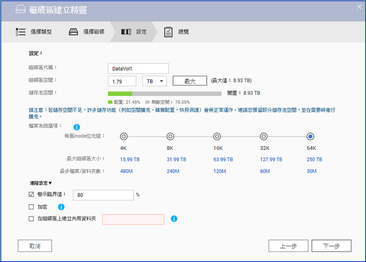 【▼】過程中可調整[每個inode位元組]大小,這會影響到磁碟區大小與檔案/資料夾數量上限。