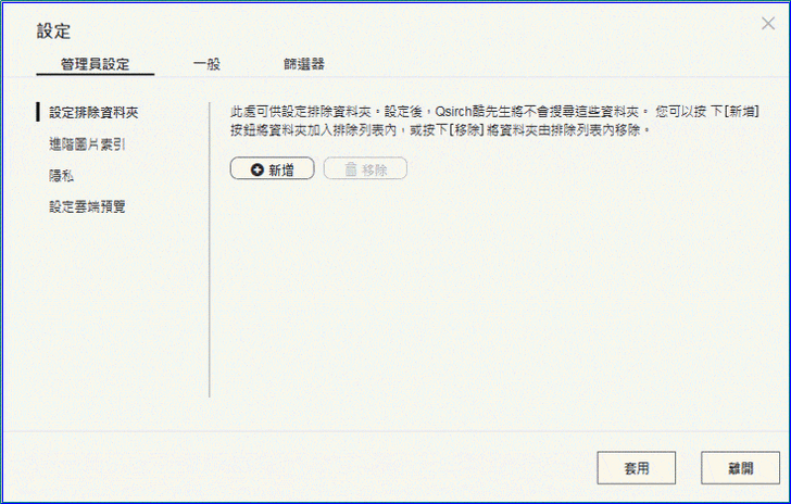 【▼】在Qsirch搜尋前除了要對資料索引外,設定的選項也很重要,包含搜尋的範圍選擇或排除、圖片顏色的索引、雲端預覽功能、對回收資料夾作搜尋以及進階檔案的篩選器等。
