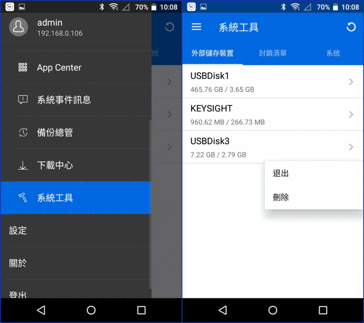 【▼】系統工具則是外部儲存裝置的處理,並提供一鍵找尋NAS位置(發出嗶嗶聲)、重開啟動、更新與關機的服務。
