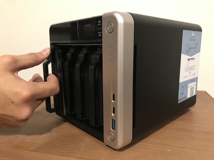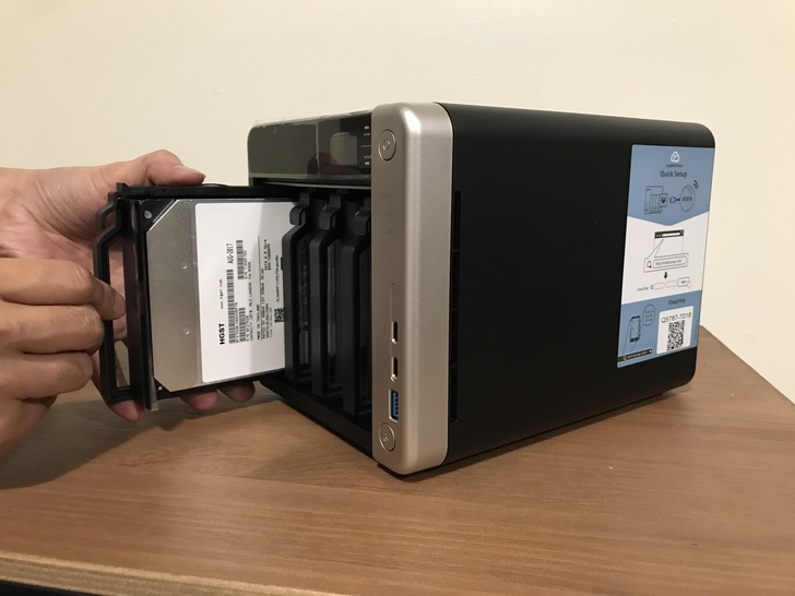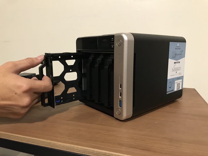 QNAP TS-453BT3十分輕巧,機身的霧面質感加分,置放硬碟的方式也很容易,只要先將機身側面的Lock鍵向上推,再把正面的蓋子往左滑動,就能看到四個硬碟的插槽,握著把上按下上方按鍵,輕輕往外一拖就能開始準備安裝硬碟。