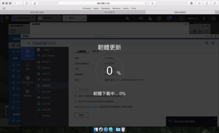 登入畫面後,會先進行一次韌體更新,在這過程中,可以聽到機器的提示聲、看到OLED 螢幕上面顯示目前狀態,這讓平常使用他牌NAS的我放心不少,因為目前使用的機型是沒有螢幕顯示的,只能透過燈示猜測目前機器的狀況。