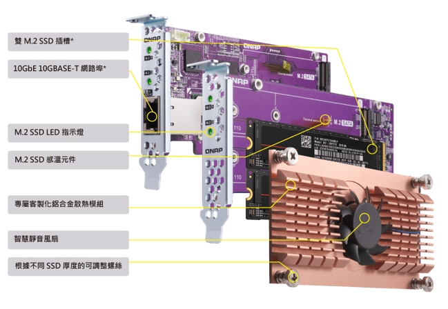 除此之外, QNAP也提供多樣配件,可彈性配置提升您 NAS 的系統效能和應用功能,滿足多樣化的儲存應用需求,像是QM2:M.2 SSD/10GbE PCIe 擴充卡、網路擴充卡、USB3.1擴充卡、SAS擴充卡及機架套件;特別值得一提的是TS-453BT3內建的QM2:M.2 SSD/10GbE PCIe 擴充卡,主打:多元、彈性,提升效能及功能應用,創新 QM2 PCIe 擴充卡系列可安裝於相容 QNAP NAS* 機種的擴充槽,為 NAS 增添 M.2 SSD 配置與擴充 10GbE RJ45 網路連線 。QM2 將 SSD 與 10GbE 擴充功能合而為一,不僅顯著提升 NAS 整體效能,亦為建立 10GbE 高速傳輸環境的經濟選擇。
