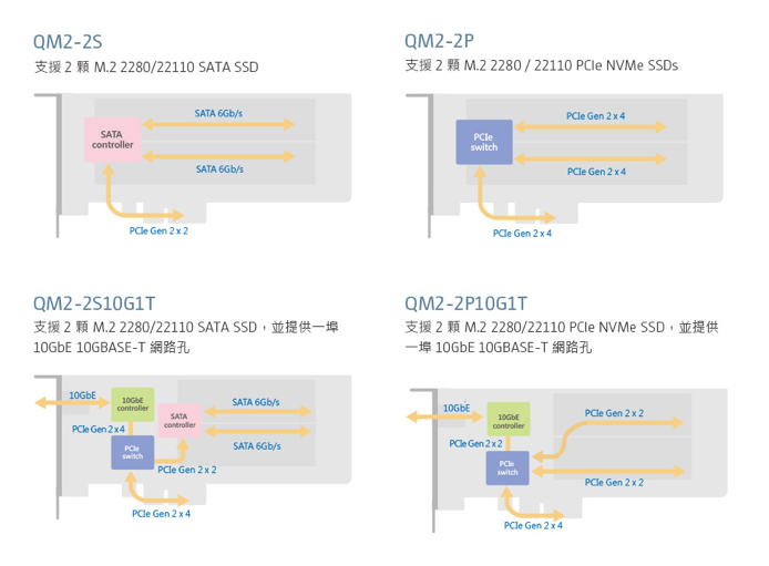 ・擴充 10GBASE-T 網路連線,可向下相容 5GbE/2.5GbE/1GbE/100MbE 連線 (僅限 QM2-2S10G1T 和 QM2-2P10G1T 可支援)