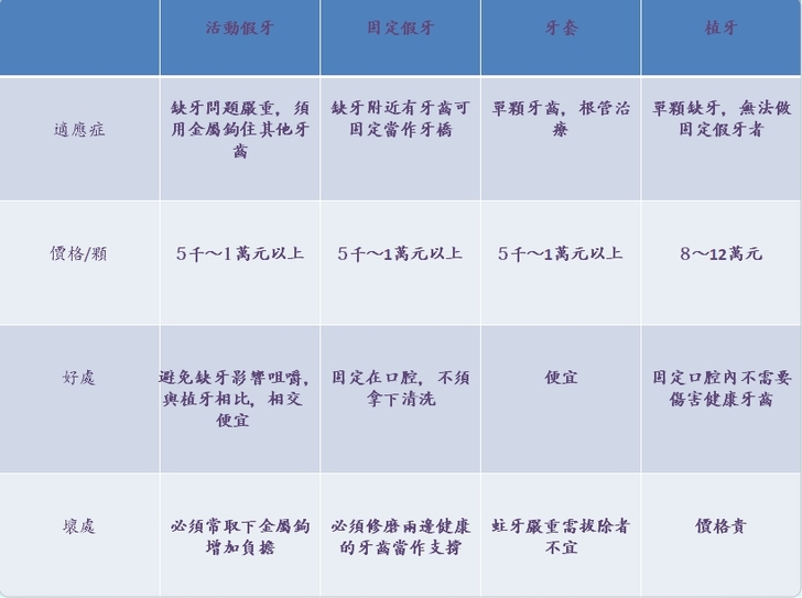 活動假牙優點是價格便宜,全口約2至4萬元,但咬合較差,且無法咬硬物,且會因有異物感而覺得不舒服。