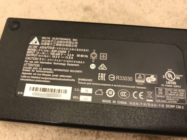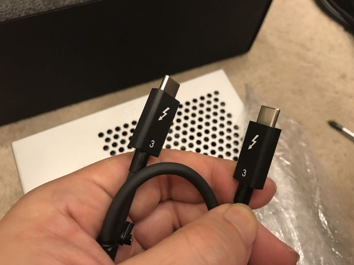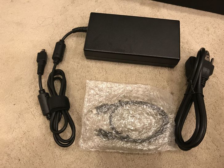 配件有adapter、電源線與0.5M長的Thunderbolt 3線,adapter為台達製造,可提供230W附贈的Thunderbolt 3線有一定的質感,且上頭的標誌很清楚說明了是Thunderbolt 3的線