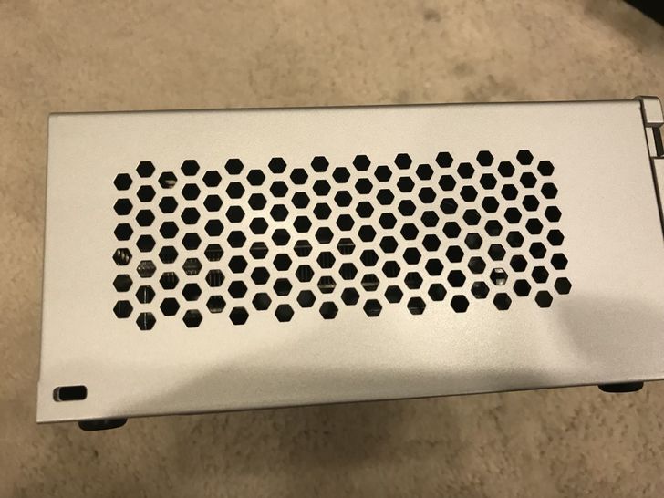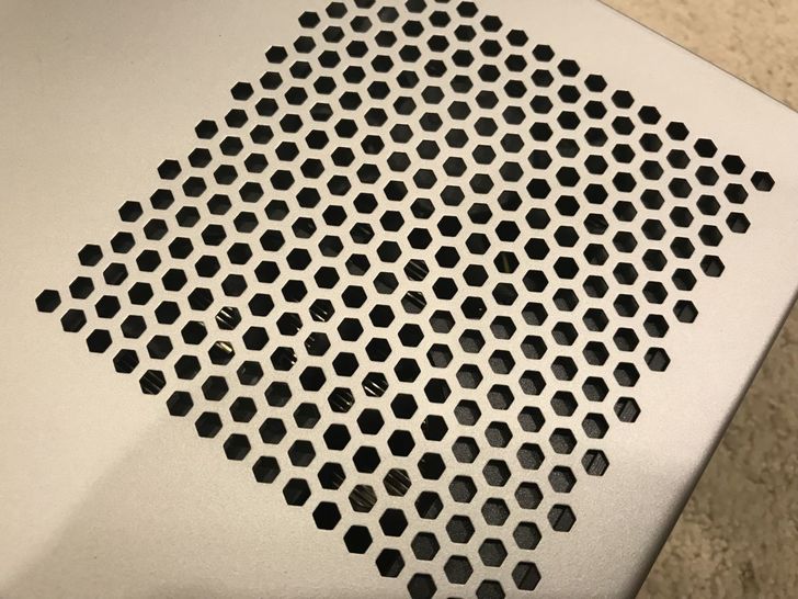 左右兩側也有蜂巢狀散熱孔,皆為排氣,而左側比較特別的是在角落有個孔,看來很像可上鎖的防盜孔?
