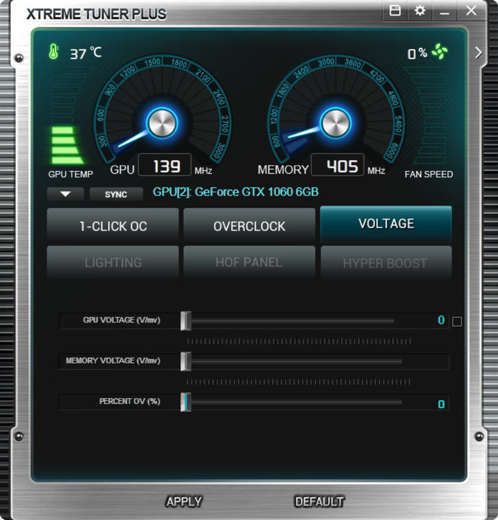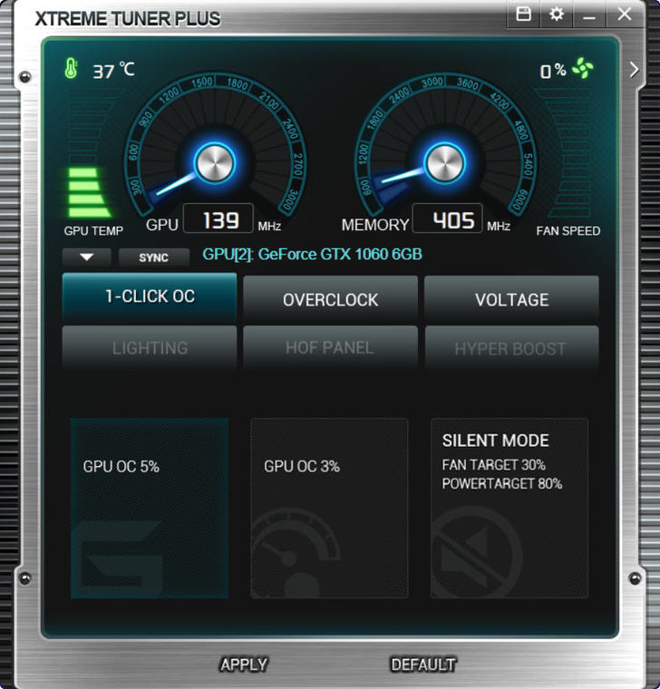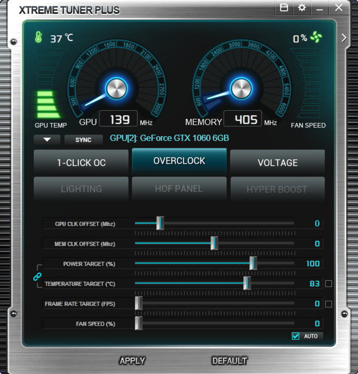 光碟內附的工具程式包含了XTREME TUNER PLUS,也可在官網下載,這程式提供簡單的一鍵超頻,也可自行調整顯卡的核心、記憶體頻率甚至是電壓
