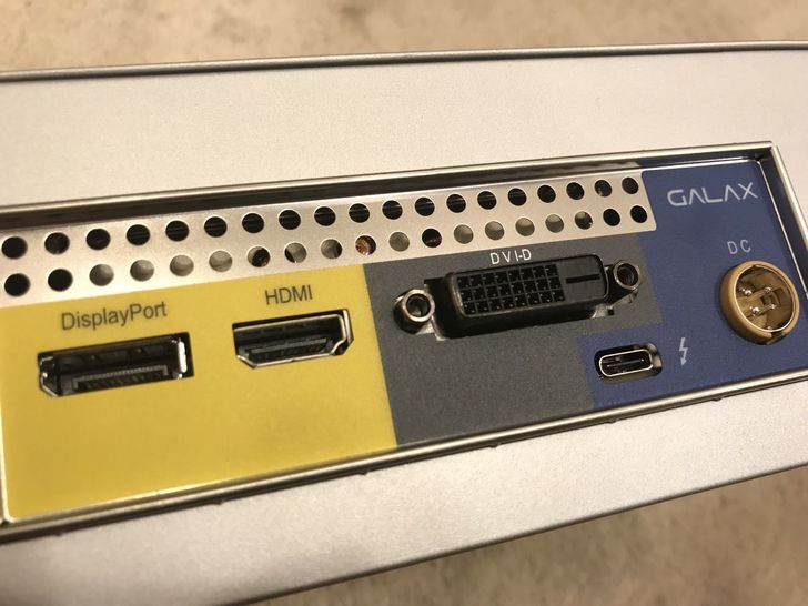 後方的連接介面,有電源輸入、Thunderbolt 3資料傳輸之外,顯卡輸出提供 1個DP、1個DVI-D和1個HDMI輸出