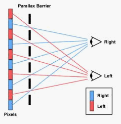 指在螢幕上設置細微的直條柵欄阻擋螢幕光線通過,遮蔽部分的畫面,因雙眼視差的關係,雙眼各自被遮蔽的部分會不相同。