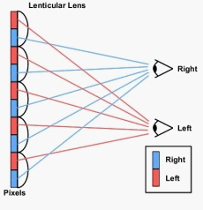 指在螢幕上設置直條狀的圓柱狀凸透鏡薄膜,透過透鏡折射角度不同造成視差的效果。如下圖所示,因光線折射的關係,使得左眼只能夠看到紅色的畫面,右眼只能夠看到藍色的畫面。但此種方式同樣也會導致畫質的降低。